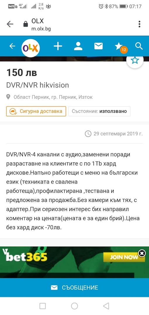 Имам 4 канален DVR, който е много китайски, но върши работа. За съжаление изгоря и реших да потърся друг, но малко по-съвременен, който да поддържа и цифрови камери. Спрях се на една обява във въпросния сайт OLX.COM, която имаше следното заглавие „DVR/NVR hikvision“ – цитирам дословно. Цената беше 150лв с хард диск и 70лв без. Реших да взема един без хард диск. Започнах разговор, който че покажа тук абсолютно пълен и без никакви модификации.