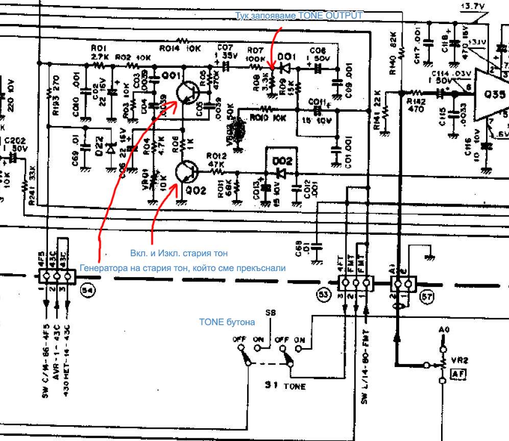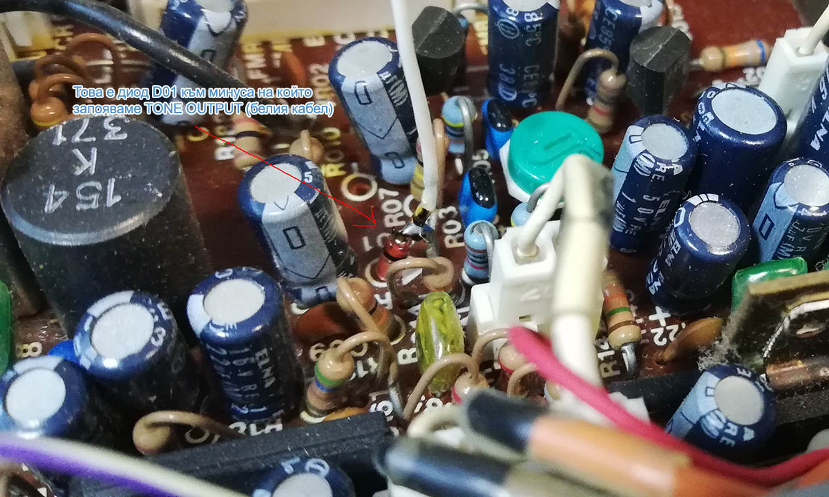 На схемата само информативно съм показал двата транзистора, които вече не се ползват. След като сте сменили стария TONE бутон с нов ключ, прекарайте през него +12V или +5V, които ще захранват модула. Така ще можете да включвате и изключвате модула от този бутон и той все пак ще върши някаква работа свързана с подаването на тон 😉 Тази функционалност не е задължителна, а препоръчителна защото не искаме да предаваме тон и на SSB, затова е добре да изключваме модула когато не ни трябва. На долната снимка показвам как точно съм запоил кабел за минуса на диода.