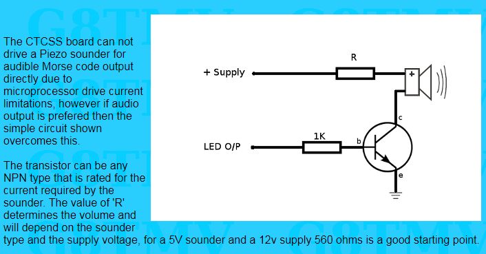Мисля че по нея всичко е ясно, вижда се къде се монтират бутоните, които вие трябва да си подсигурите, +5V или +12V ще ви вземете от схемата на радиото, не е трудно да се премери къде има такива напрежения, PTT може да вземете от TONE бутона на радиото, който ще модифицираме да включва и изключва платката, за да не предава когато не ни трябва. В този си вид платката подава светлинна индикация по морзовата азбука, но на сайта е показана схема, с помощта на която можете да си добавите и звукова индикация, ето я и нея: